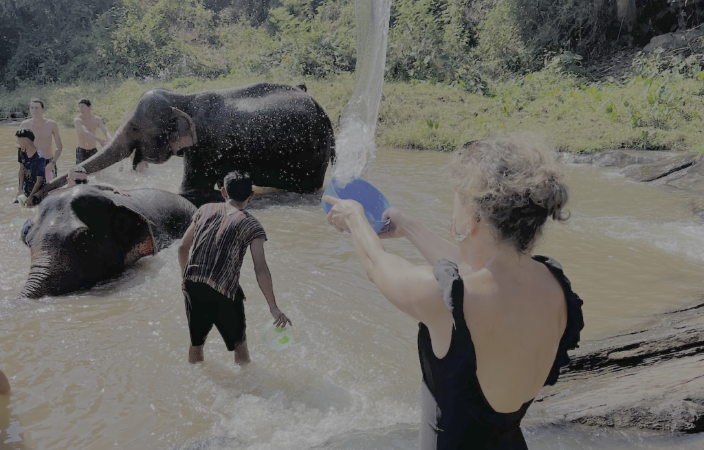 And yes, during that journey, the family really did take part in bathing elephants near Chiang Mai, Thailand – turning that playful idea into a real memory.